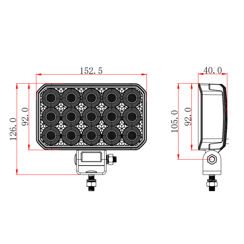 Power (Measured): 70W (±3%) Light Source Specifications: 1W*90PCS (PHILIPS) Operating Voltage: 9-30V DC Luminous Flux: 6500LM Electromagnetic Compatibility: ECE R10 LED Color Temperature: 5700K-6000K Beam Angle: Flood Cable Specifications: Bare wire (36CM) Light Source Lifetime: ≥50000 hours Certifications: CE/RoHS/IP69K Lamp housing material: Aluminum alloy Surface treatment: Electrostatic powder coating Lens material: PC Bracket/screw material: Stainless steel Vibration resistance grade: 10G/30G Impact resistance grade: 60G Protection rating: IP68/IP6K9K Operating temperature: -40℃ to 85℃ Salt spray rating: 500H![]()