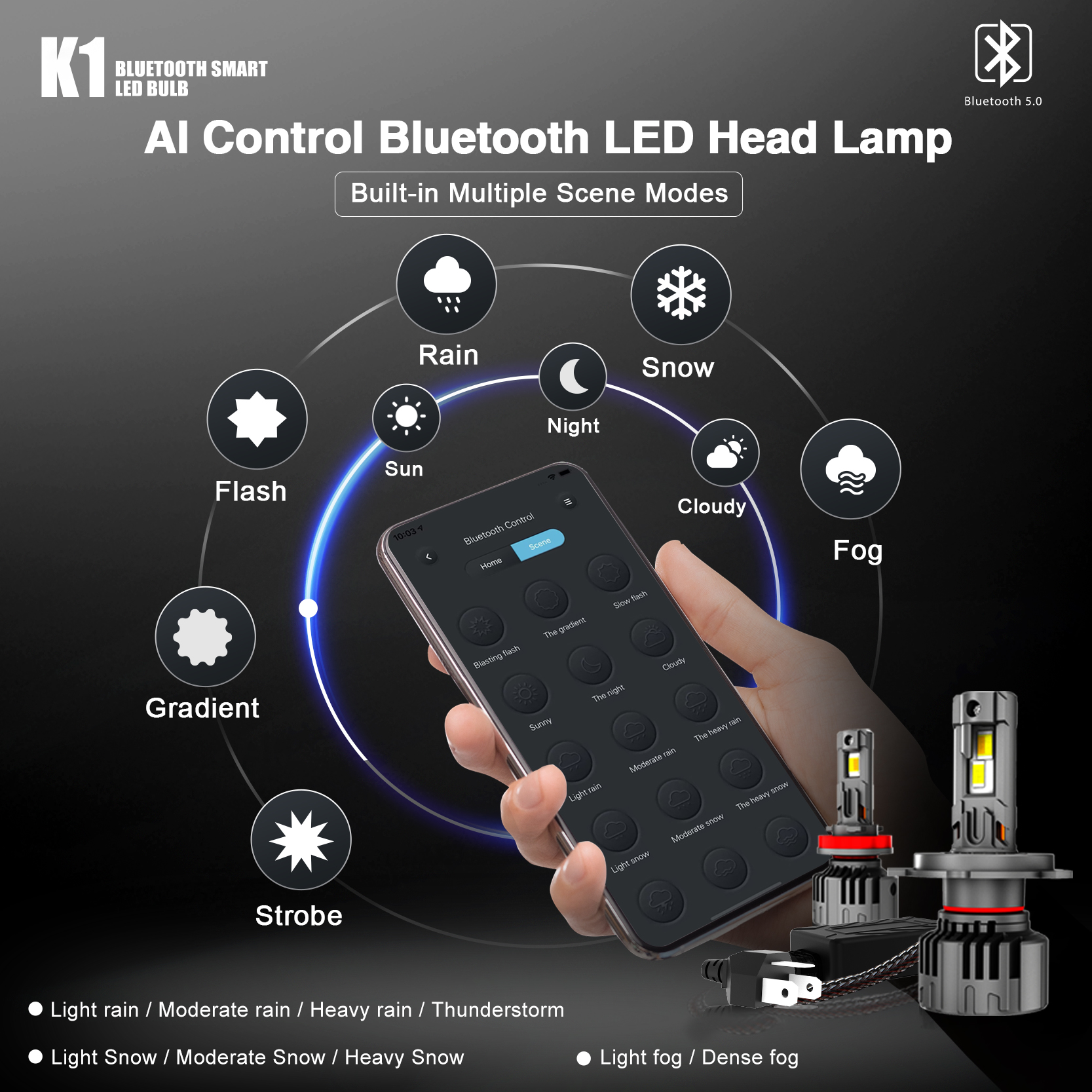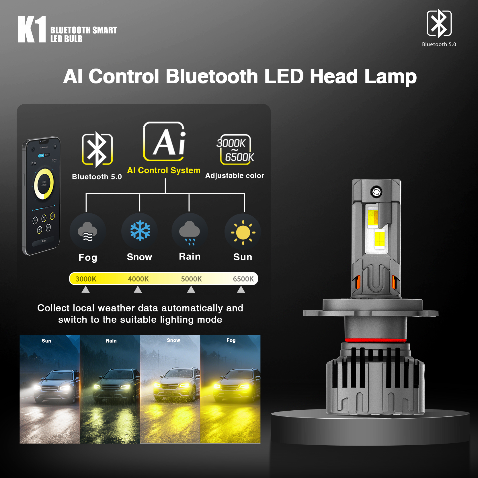 Home > Products > Led Headlight > K1 Led Headlight 130W AI Control Bluetooth Led Head Lamp DRL Strobe Warning 3000K~6500K